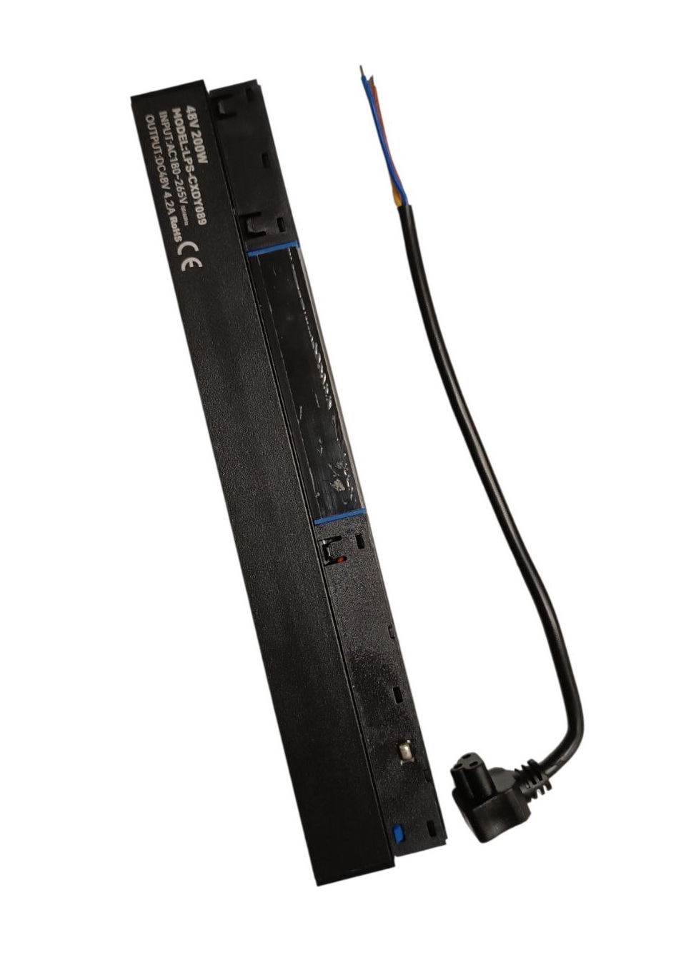 Блок питания 200Вт/48V для магнитного шинопровода — это низковольтный понижающий трансформатор, который преобразует 220V (сеть) в безопасное для магнитной системы напряжение 48V, позволяя подключать светильники и перемещать их по треку, обеспечивая питание до 200 Вт.