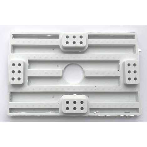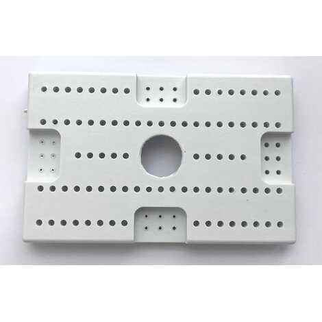 На поверхность площадки нанесены отверстия для саморезов, края площадки закруглены, имеет четыре точки крепления к потолку.