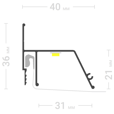 Скрывается полотном. Мощность светодиодной ленты не более 14,4 Вт / м. Варианты крепления: горизонтальная полка - больше всего света; вертикальная - упрощает монтаж при внутренних и внешних углах; наклонная площадка - на прямых участках получится более четкая граница световой линии в 31 мм.