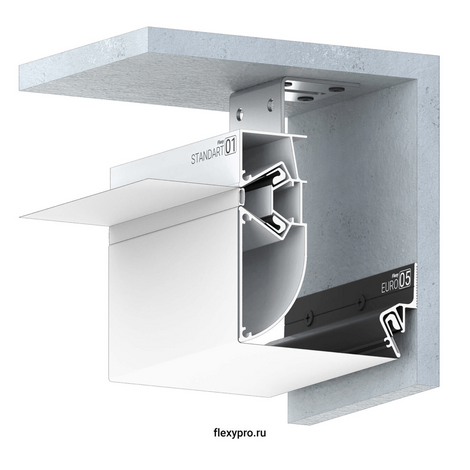 Прямой профиль Flexy STANDART 01 для многоуровневых натяжных потолков с гарпунной системой крепления полотна. С разделительной вставкой. Без подсветки.