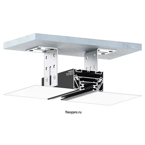 Разделительный профиль Flexy TREK 01 для натяжных потолков с гарпунной системой крепления полотна. Для установки однофазной трековой шины. Для изготовления встраиваемых и накладных световых линий, подвесных и накладных светильников, щелевых вытяжек.