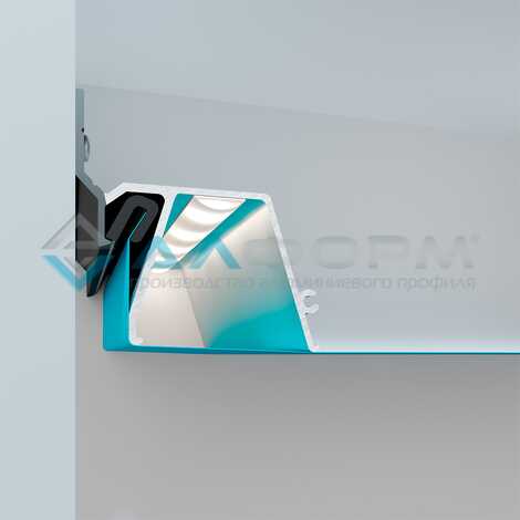 Алюминиевый профиль для монтажа натяжного потолка без вставки с ярко выраженным зазором около стены и подсветкой через полотно.