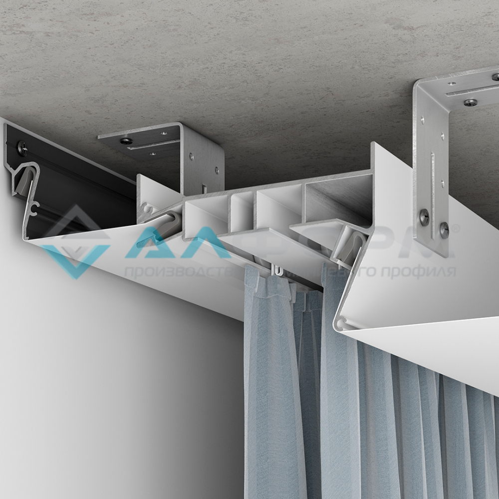 Для скрытого крепления штор и создания ниши под карниз потолочного крепления предназначен профиль Профиль Парсек ПК15 Карниз двухрядный, белый (3,2м). Этот профиль отличается от ПК-5 тем, что имеет два ряда креплений для штор. Он легко соединяется со стандартным стеновым багетом и системами контурного потолка. Во время монтажа он крепится к основному потолку с помощью металлических уголков.