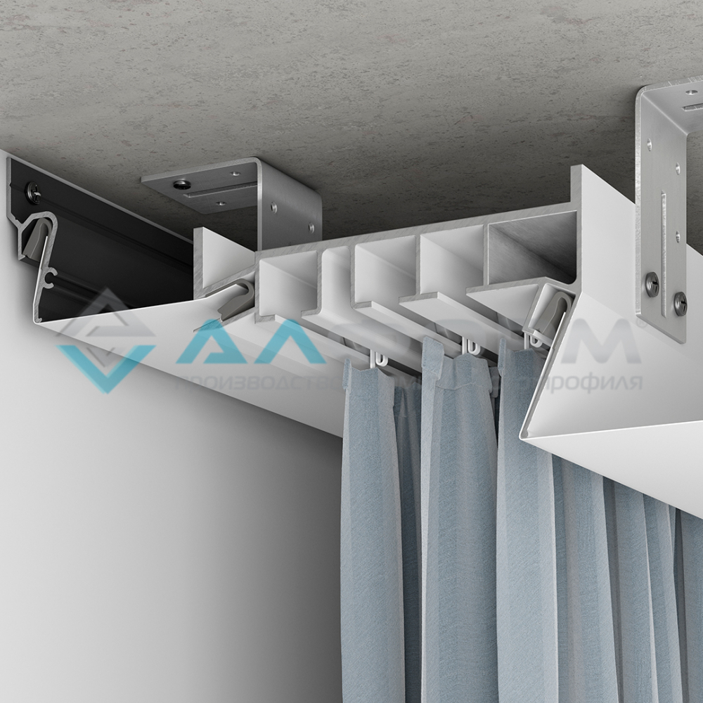 Профиль карниз ПК 5 для ПВХ потолков. Имеет 3 полосы под шторы (трёхрядный). Возможна установка светодиодной ленты. У современных дизайнеров домашнего интерьера в тренде устанавливать гардины в скрытой нише над окном. ПК5 профиль натяжных потолков удержит шторы из любой ткани, занавесь будет плавно нисходить от линии соприкосновения с потолочной поверхностью, поддерживать комфортный интерьер в помещении.