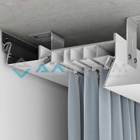 Профиль карниз ПК 5 для ПВХ потолков. Имеет 3 полосы под шторы (трёхрядный). Возможна установка светодиодной ленты. У современных дизайнеров домашнего интерьера в тренде устанавливать гардины в скрытой нише над окном. ПК5 профиль натяжных потолков удержит шторы из любой ткани, занавесь будет плавно нисходить от линии соприкосновения с потолочной поверхностью, поддерживать комфортный интерьер в помещении.