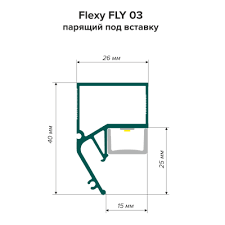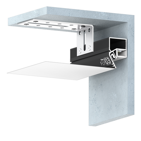 Потолочный парящий профиль Flexy FLY 03 для натяжных потолков с гарпунной системой крепления полотна. С полкой для светодиодной ленты и креплением для светорассеивающей вставки.