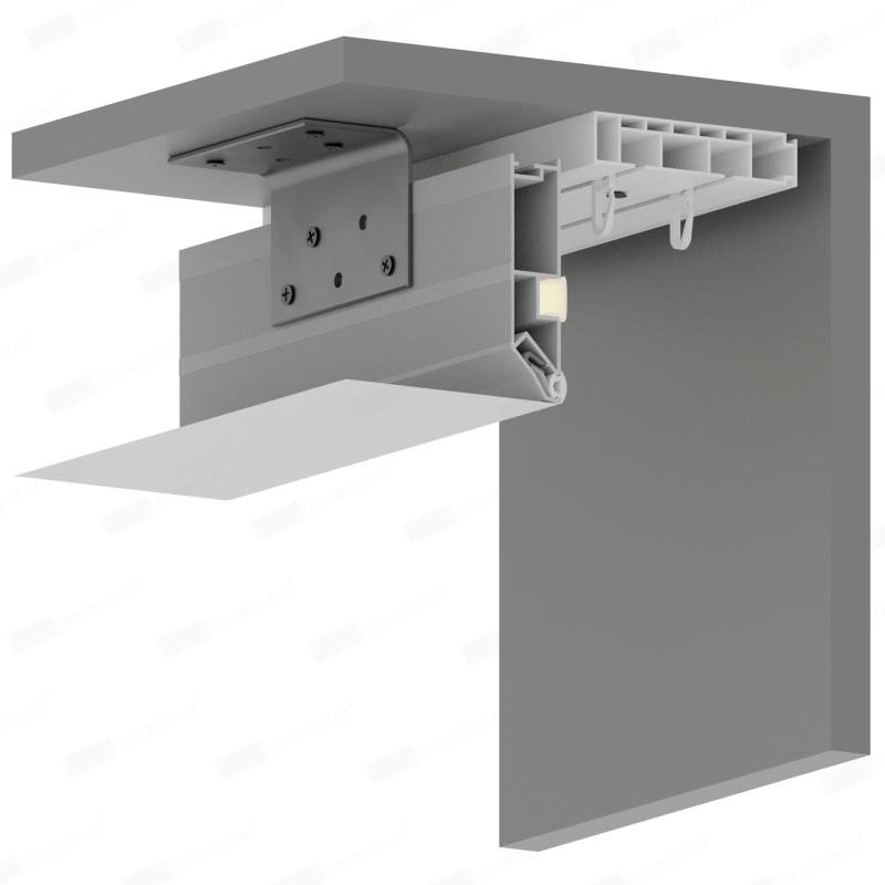 Переход для карниза – это специальный алюминиевый профиль чёрного цвета и длиной 2 метра, окрашенный в белый или черный цвет, предназначенный для изготовления ниши под карниз. Конструкция профиля предусматривает возможность установки подсветки. Паз для светодиодной ленты закрывается ПВХ рассеивателем для более равномерного и плавного рассеивания света. Паз для заправки гарпуна закрывается разделительной вставкой.
