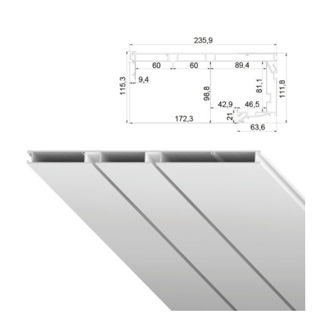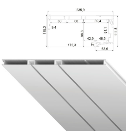 Представляет собой алюминиевый профиль белого или черного цвета с двумя рядами для крепления крючков с одной стороны и имеет (ровную, плоскую) цельную поверхность с другой стороны, высота профиля составляет 13 мм, ширина 231,6 мм, расстояние между дорожками 60 мм.