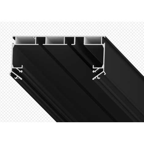 Скрытый карниз SK02: Разновидность дизайнерского карниза. Он представляет собой цельнометаллический профиль белого или черного цвета с двумя рядами для крепления крючков. Обладает увеличенным размером между рядами для крепления штор. Карниз имеет оптимальную ширину, для того чтобы складки на шторах формировались правильно. Возможна установка светодиодной ленты для подсветки штор, которая направлена вертикально вниз и закрывается рассеивателем. Конструкция профиля предусматривает фиксацию полотна при помощи гарпунной системы крепления. Вертикальный паз для фиксации гарпуна закрывается маскирующей вставкой, алюминиевой или ПВХ.