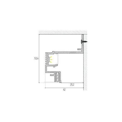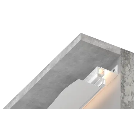 Самонесущая конструкция парящего профиля с фиксированным отступом от стены и мягкой подсветкой, не подчёркивающей неровности стены. Профиль поставляется в комплекте с демпфером.