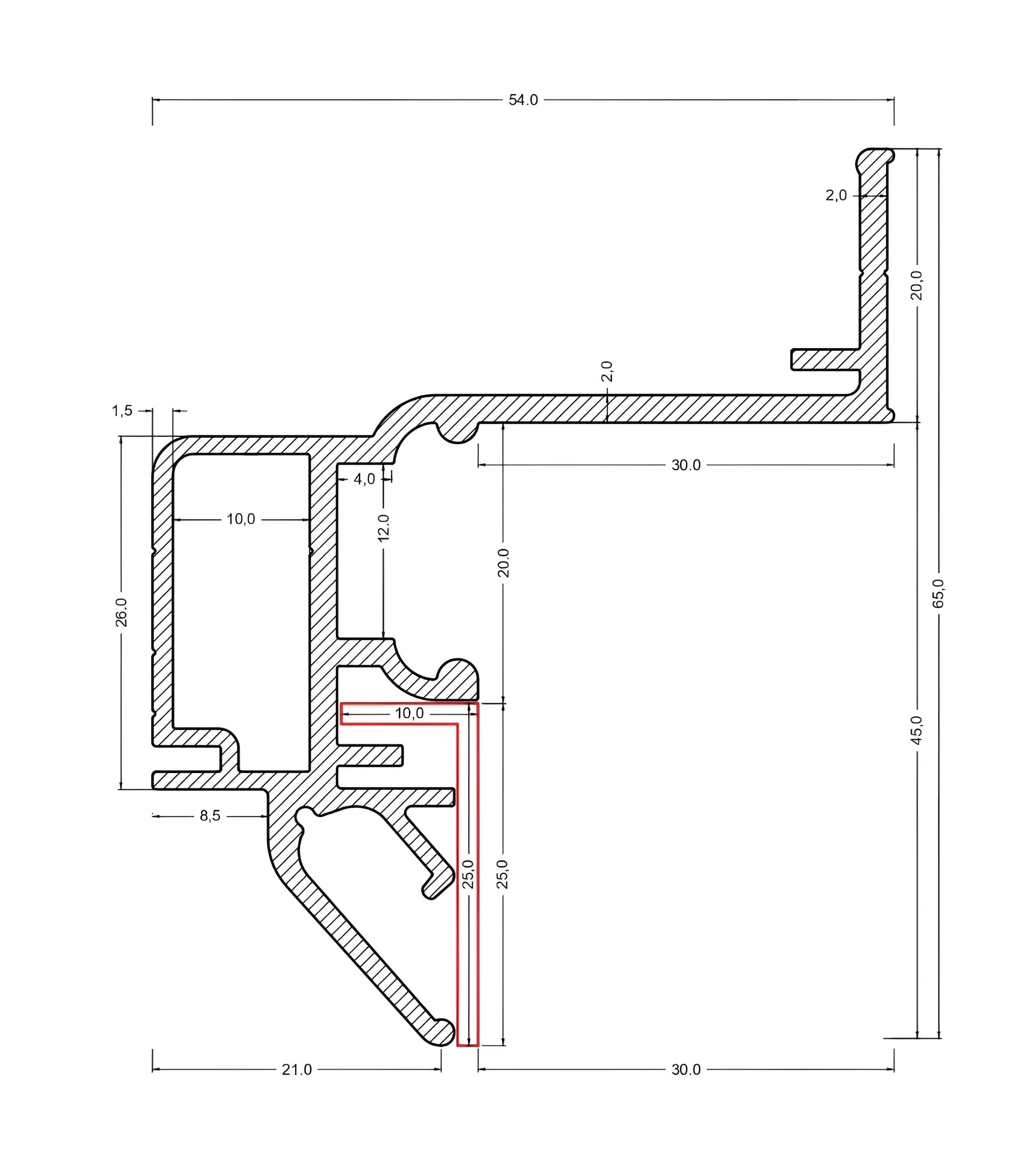 Дополнительно в профиле предусмотрена камера для крепления под 13-й саморез, что позволяет комфортно работать с различными материалами, такими как керамогранит и зеркала, а также монтировать различные конструкции через потолок, обеспечивая надежное соединение двух профилей как по углам, так и по прямым участкам. Соединительные пазы способствуют удобному выравниванию двух профилей в горизонтальной плоскости.