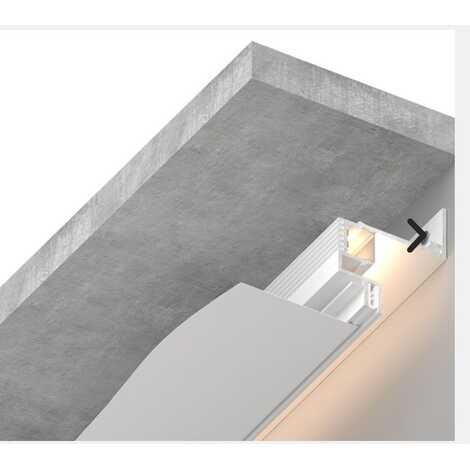 Самонесущая конструкция парящего профиля с фиксированным отступом от стены и мягкой подсветкой, не подчёркивающей неровности стены. Профиль поставляется в комплекте с демпфером.