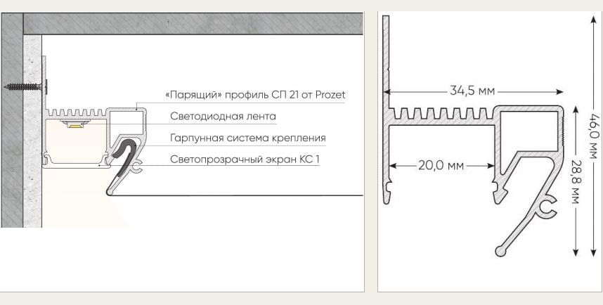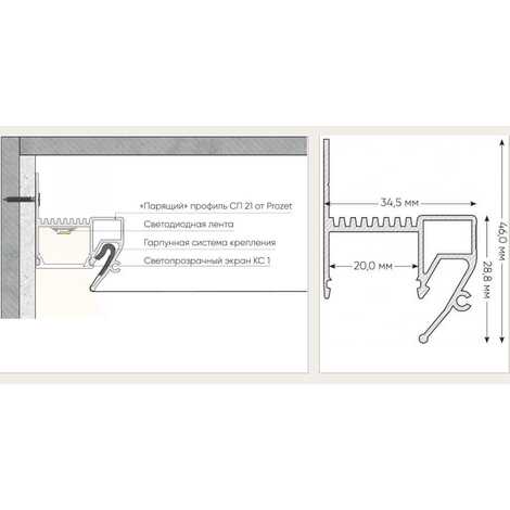 Профиль крепится к стене и устанавливается со светопрозрачным экраном KS17. Светодиодная лента крепится так, что световой поток направлен вниз параллельно стене, лента защищена от влаги.