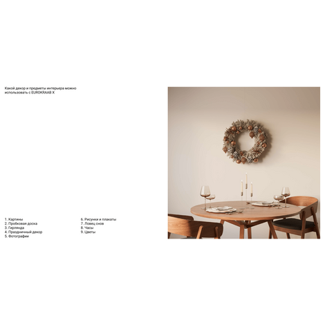 На крючок можно повесить целое разнообразие предметов интерьера — гирлянды, праздничный декор, картины, фотографии, пробковую доску, часы и др. С помощью EUROKRAAB X вы закладываете возможность на будущее, если захотите добавить, поменять или убрать декор.