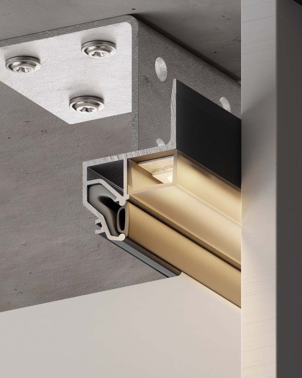 Конструкционный парящий профиль для натяжных потолков с гарпунной системой крепления полотна, паз под гарпун закрывается вставкой. С полкой для светодиодной ленты и креплением для светорассеивающей вставки. Добавлена камера для вкручивания саморезов.