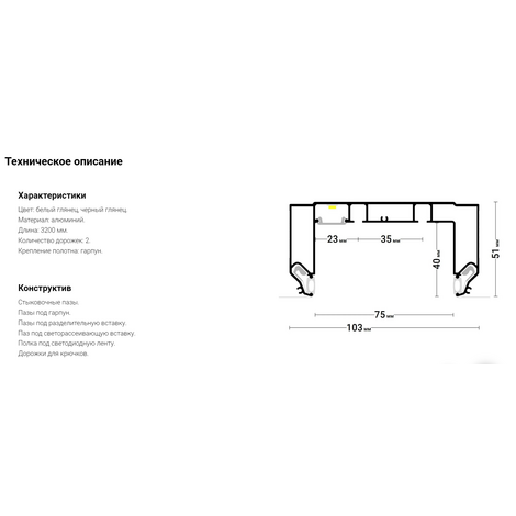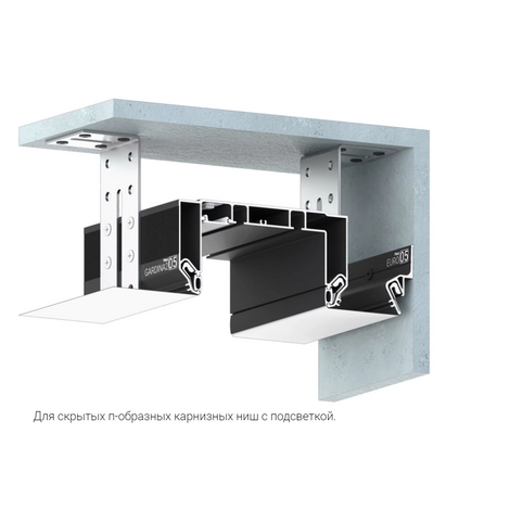 Профиль Flexy GARDINA2 05 для изготовления скрытых п-образных карнизных ниш с двумя пазами для установки штор и гардин. С подсветкой. Для гарпунной системы крепления полотна.