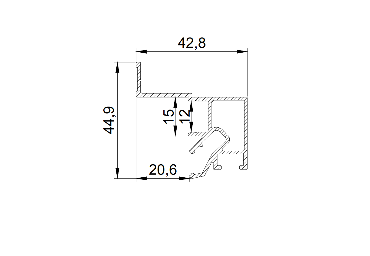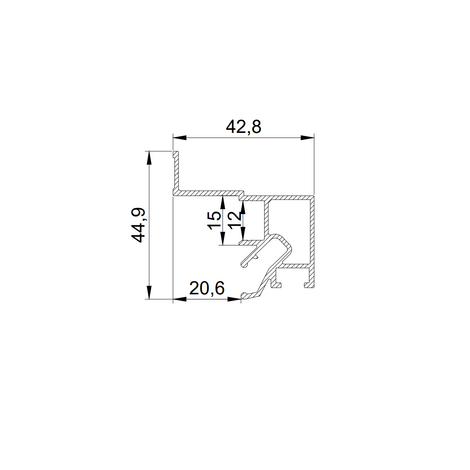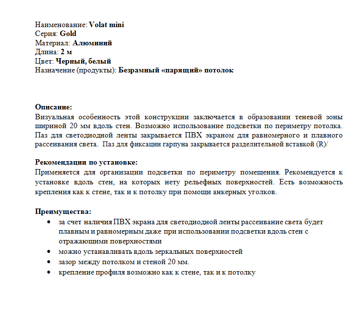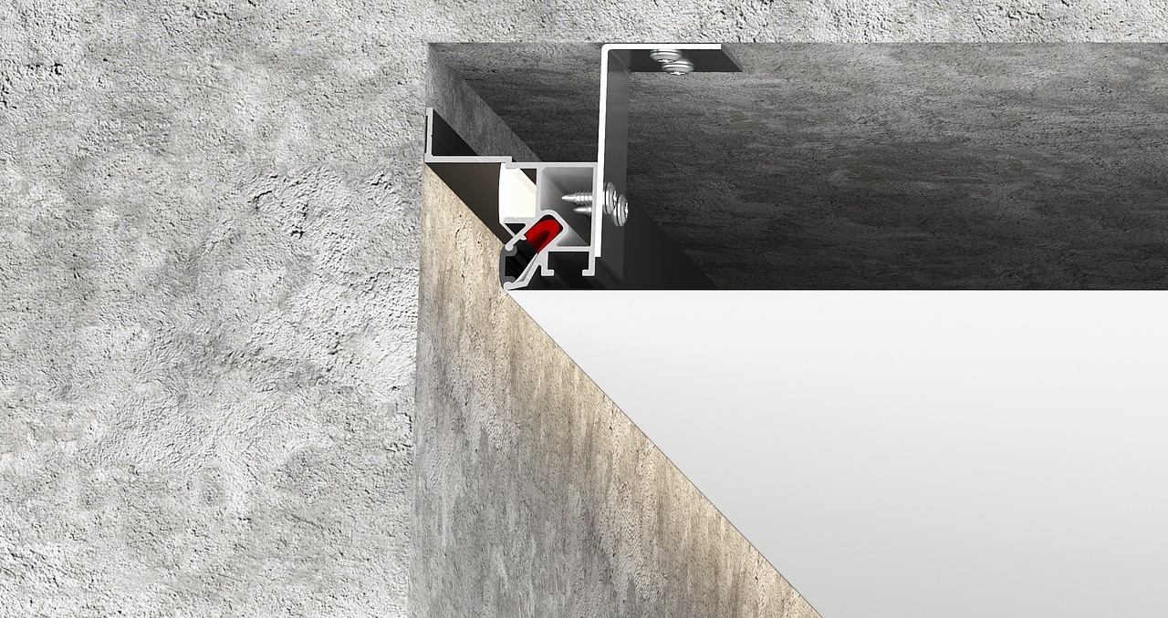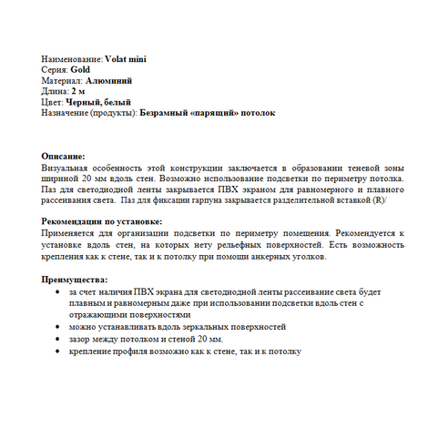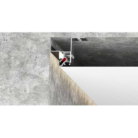 Визуальная особенность этой конструкции заключается в образовании теневой зоны шириной 20 мм вдоль стен. Возможно использование подсветки по периметру потолка. Паз для светодиодной ленты закрывается ПВХ экраном для равномерного и плавного рассеивания света. Паз для фиксации гарпуна закрывается разделительной вставкой (R)