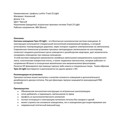 Система освещения Трек 23 Light – это безопасная низковольтная система освещения. В конструкции используется специальный монолитный алюминиевый профиль, в который установлены токопроводящие дорожки, через которые подается электропитание на светильники.