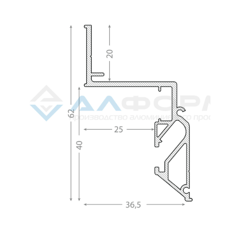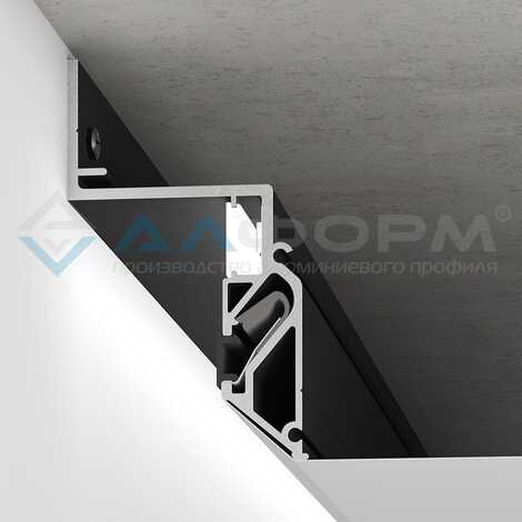 Алюминиевый профиль для монтажа натяжного потолка из ПВХ пленки на гарпунной системе крепления с возможностью организации парящего эффекта с увеличенным зазором и подсветкой вдоль периметра помещения.
