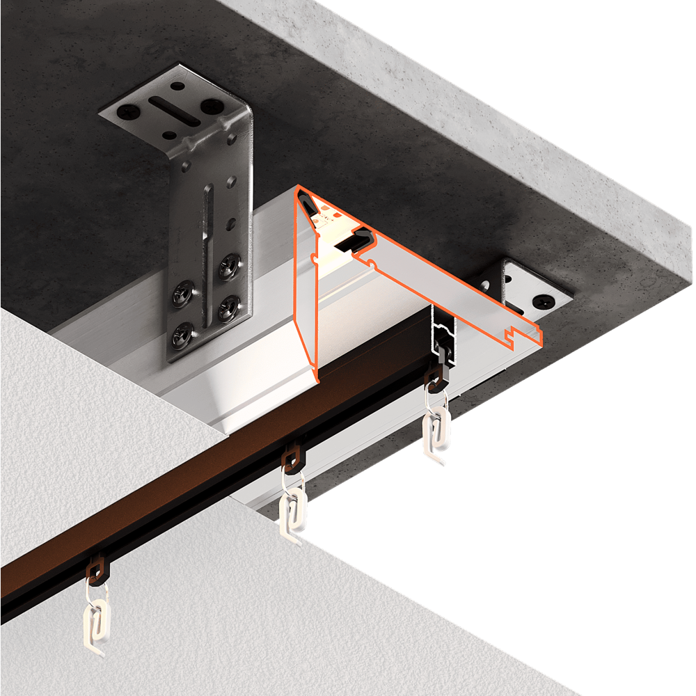 Профиль Flexy STANDART01 60 LED для изготовления прямых ниш для штор с подсветкой с последующей установкой накладных карнизов. Для гарпунной системы крепления полотна.