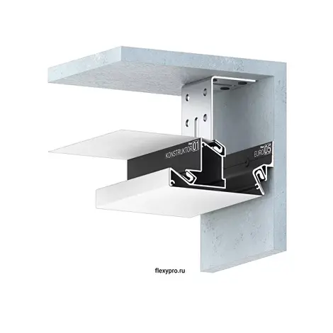 Профиль Flexy KONSTRUKTOR 01 для многоуровневых натяжных потолков с гарпунной системой крепления полотна. Для изготовления ниш под установку накладных, точечных и линейный светильников. С полкой для светодиодной ленты.