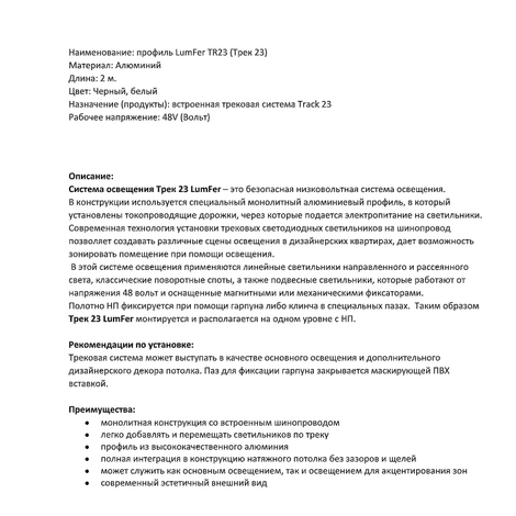 Система освещения Трек 23 LumFer – это безопасная низковольтная система освещения. В конструкции используется специальный монолитный алюминиевый профиль, в который установлены токопроводящие дорожки, через которые подается электропитание на светильники.