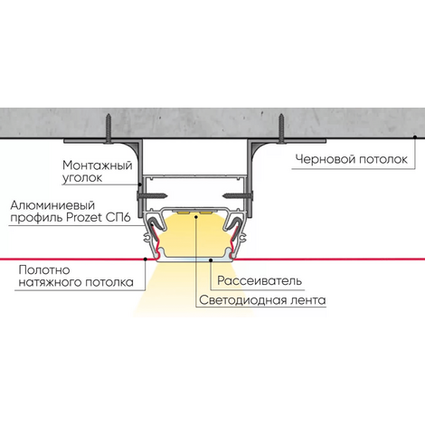 Профиль алюминиевый ПФ6838. Используется для создания конструкций натяжного потолка с ровной контурной подсветкой с помощью скрытой led ленты.