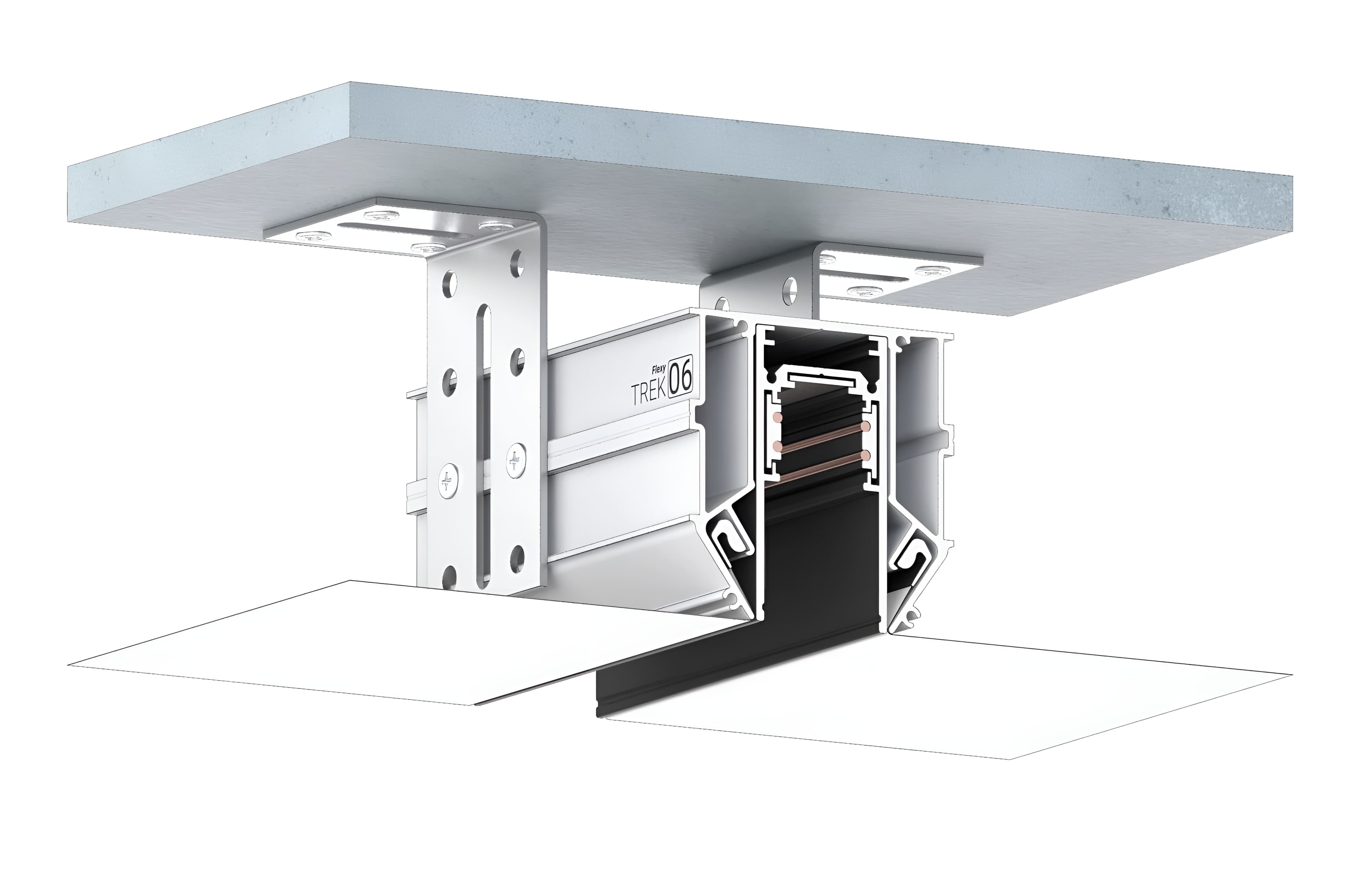 Профиль Flexy TREK 06 предназначен для натяжных потолков с гарпунной системой крепления полотна. В него устанавливается профиль Flexy TREK 05, который служит основой для монтажа трековых светильников Flexy LIGHT 20 и 2038. Этот профиль обеспечивает надежное крепление светильников и позволяет создавать интегрированные световые решения в потолочной конструкции, поддерживая аккуратный и современный дизайн.