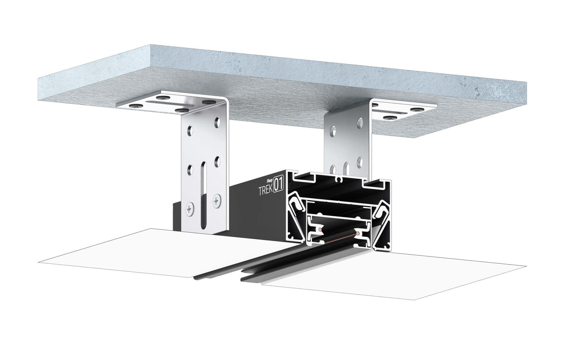 Профиль Flexy TREK 01 разработан для натяжных потолков с гарпунной системой крепления полотна. Он предназначен для установки однофазной трековой шины и позволяет создавать встроенные световые линии, а также устанавливать подвесные и накладные светильники. Кроме того, профиль может использоваться для монтажа щелевых вытяжек, обеспечивая аккуратный и функциональный дизайн потолка.
