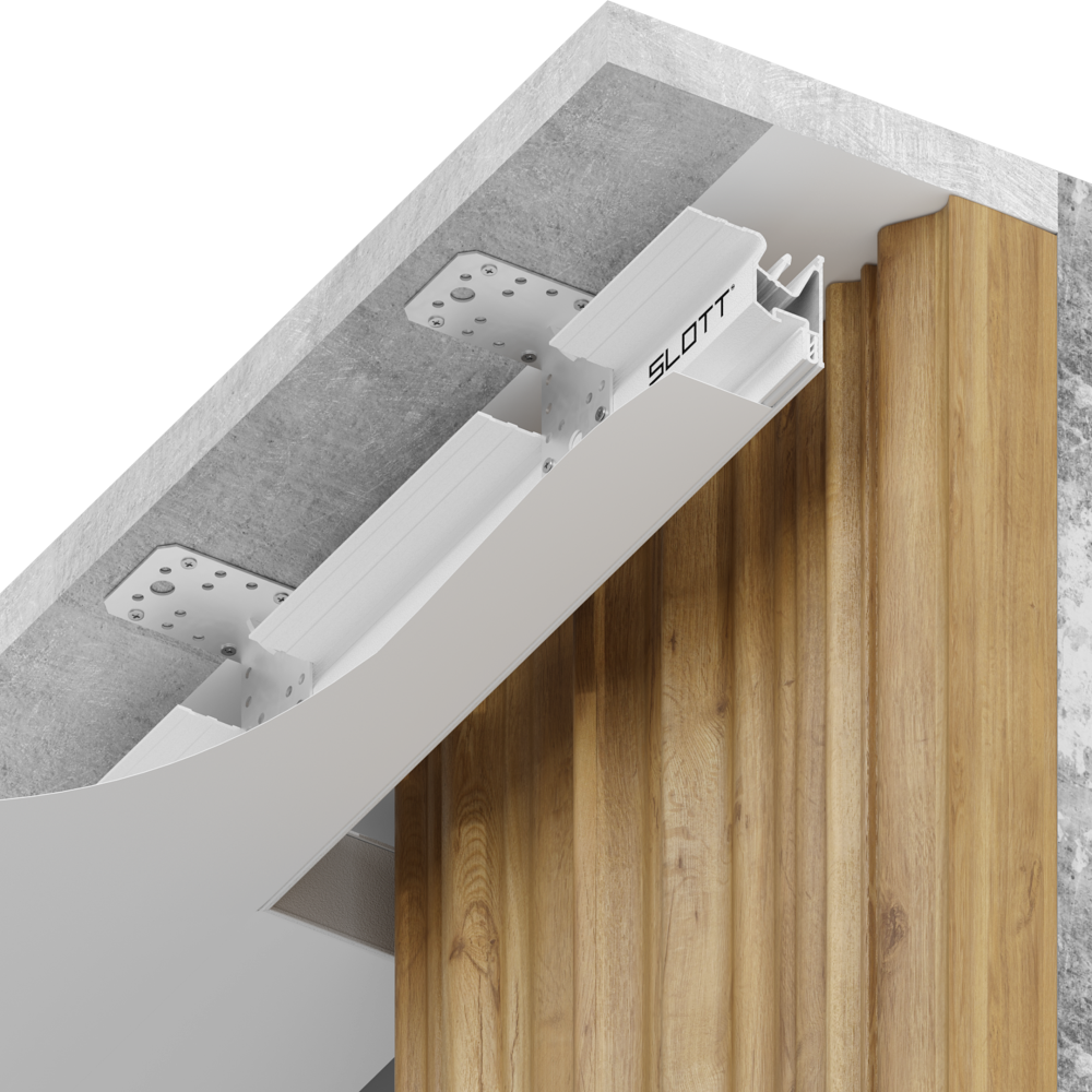 Профиль Slott 40, предназначен для монтажа в натяжной потолок ПВХ. Можно использовать в качестве основного освещения (световые линии) или в качестве базы в виде черной ниши для размещения дополнительных осветительных приборов и/или трек-системы.