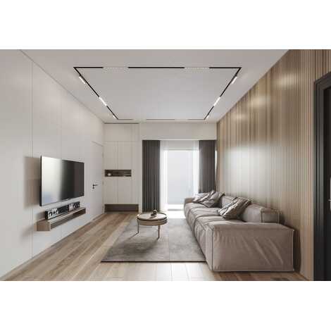Современная технология установки трековых светодиодных светильников на шинопровод позволяет создавать различные сцены освещения в дизайнерских квартирах, дает возможность зонировать помещение при помощи освещения.