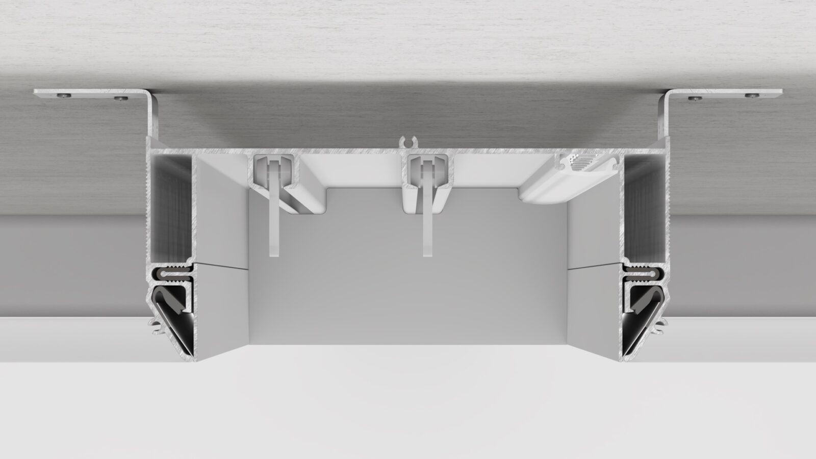 Скрытый «П-образный» карниз с алюминиевым бампером, подсветкой и креплением натяжного потолка в одной плоскости.