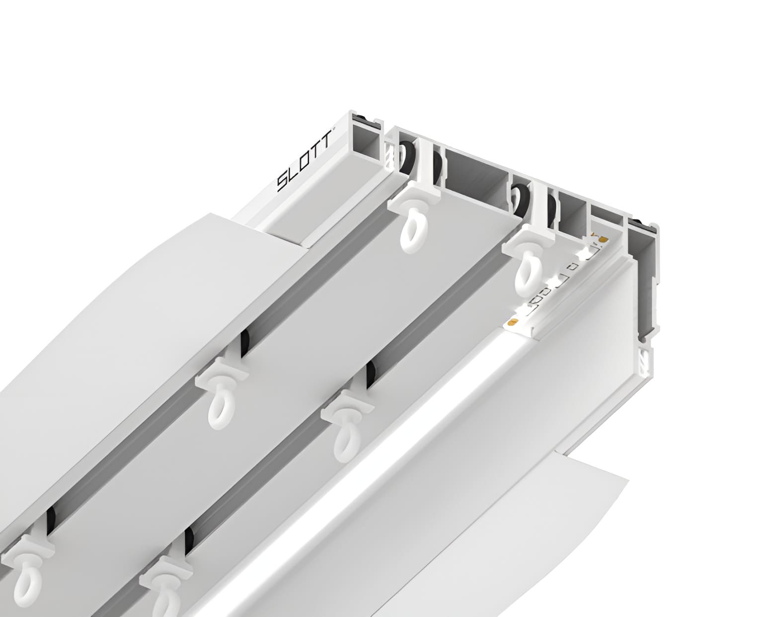 Система SLOTT Parsek — это механический двухрядный карниз, где первый ряд предназначен для штор, а второй — для тюля. Профиль изготовлен из цельного алюминия, что обеспечивает его прочность и долговечность. Особенностью карнизной системы является специально разработанный выступающий край, который формирует нишу и скрывает бегунки от глаз, оставляя видимой только штору. Профиль комплектуется демпфером.