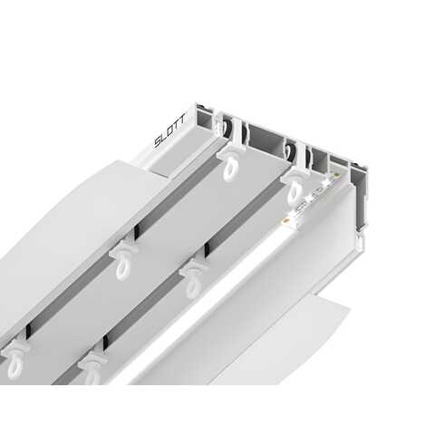 Гардинный профиль SLOTT Parsek оснащен скрытой системой освещения с встроенным рассеивателем, направляющим свет строго вниз по шторе. Это декоративное освещение придает помещению уют и стиль. Светодиодная лента для подсветки не входит в комплект и приобретается отдельно в зависимости от желаемых характеристик (цветовая температура, мощность, напряжение и т.д.). Если дополнительное освещение не требуется, ленту можно не устанавливать.