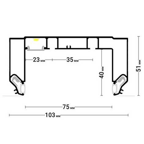 Профиль GARDINA2 05 для изготовления скрытых карнизных ниш с двумя дорожками для установки штор и гардин. С подсветкой (паз под светорассеивающую вставку и полка под светодиодную ленту). Для гарпунной системы крепления полотна, с пазом под разделительную вставку.