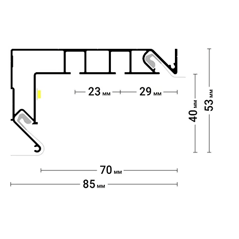 Конструктив Стыковочные пазы. Вертикальный паз под гарпун. Паз под бандаж. Полка под светодиодную ленту. Разметка для установки саморезов. Усиленный отбойник для жесткости.