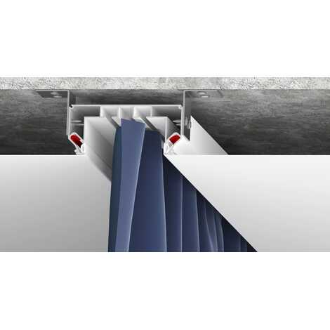 Универсальный карниз – разновидность дизайнерского карниза. Он представляет собой цельнометаллический профиль белого или черного цвета с двумя рядами для крепления крючков и местом для установки подсветки. Карниз имеет оптимальную ширину для того, чтобы складки на шторах формировались правильно. Возможна установка светодиодной ленты для подсветки штор, которая направлена вертикально вниз и закрывается рассеивателем. Конструкция профиля предусматривает фиксацию полотна при помощи гарпунной системы крепления. Вертикальный паз для заправки гарпуна закрывается разделительной вставкой (R).