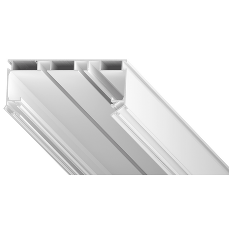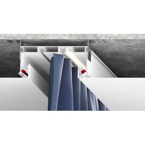 Скрытый карниз SK02: Разновидность дизайнерского карниза. Он представляет собой цельнометаллический профиль белого или черного цвета с двумя рядами для крепления крючков. Обладает увеличенным размером между рядами для крепления штор. Карниз имеет оптимальную ширину, для того чтобы складки на шторах формировались правильно. Возможна установка светодиодной ленты для подсветки штор, которая направлена вертикально вниз и закрывается рассеивателем. Конструкция профиля предусматривает фиксацию полотна при помощи гарпунной системы крепления. Вертикальный паз для фиксации гарпуна закрывается маскирующей вставкой, алюминиевой или ПВХ.