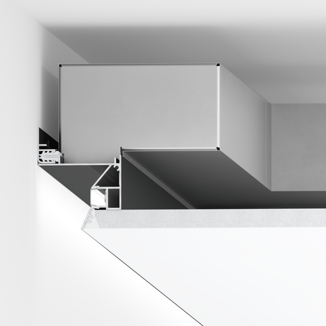 Двусоставной потолочный профиль с перфорацией для организации вентиляции, имеющий возможность установки камеры статического давления (КСД) для локализованного перемещения воздушных масс. Монтируется с каркасом потолка для обеспечения декоративного зазора в 30мм. Связь со стеной обеспечивается с помощью базового профиля UMBRA через подвижный полимерный элемент.
