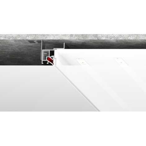 Встроенный светильник: профиль применяется совместно с профилем BP01 (безрамный) для изготовления встроенных светильников. Изготавливается контур из профиля BP01, в центральной части которого монтируются светодиодные линейки в качестве источника света. Далее крепится LB02 mini, в который при помощи специального канта ПВХ монтируется полупрозрачное полотно с изображением или без него. Таким образом получается встроенный светильник, полностью интегрированный в натяжной потолок без заглушки и зазоров.