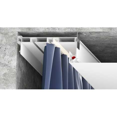 Скрытый карниз 03: Разновидность дизайнерского карниза, который устанавливается вплотную к стене. Он представляет собой цельнометаллический профиль белого или черного цвета с двумя рядами для крепления крючков. Карниз имеет оптимальную ширину для того, чтобы складки на шторах формировались правильно. Возможна установка светодиодной ленты для подсветки штор, которая направлена вертикально вниз и закрывается рассеивателем. Конструкция профиля предусматривает фиксацию полотна при помощи гарпунной системы крепления. Вертикальный паз для фиксации гарпуна закрывается маскирующей вставкой, алюминиевой или ПВХ.