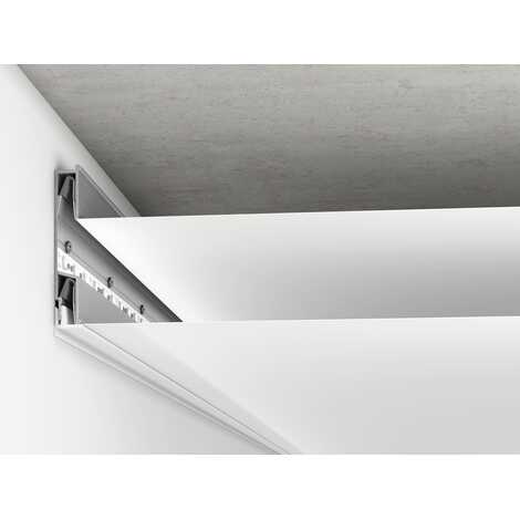 В профиль ПК4 заправляются 2 полотна: 1-е (верхнее) базовое белого цвета, 2-е (нижнее) полупрозрачное, между полотен закладывается светодиодная лента достаточной мощности. По итогу получается натяжной потолок с полной засветкой, выполняющий одновременно роль источника света. Зазор между стеной и потолком маскируется вставкой.