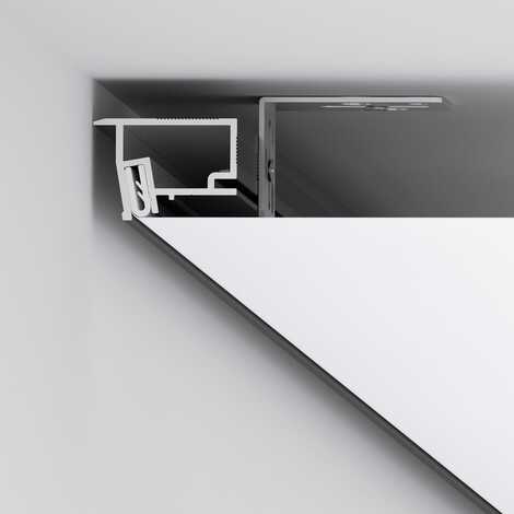 Профильная система SLIM EuroSlott с высотой профиля всего 20 мм позволяет максимально сохранить высоту финишного потолка. Крепится на специальные консоли к потолку.