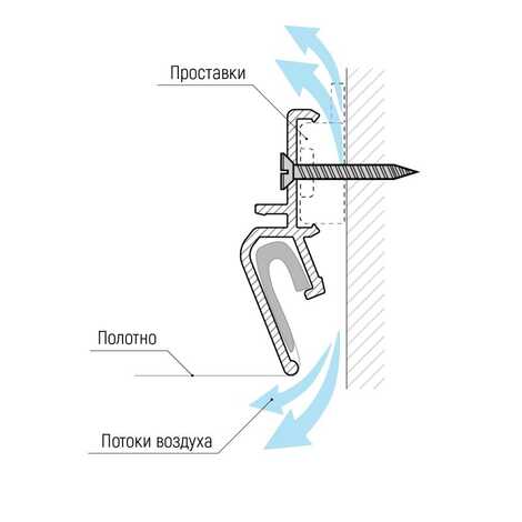 Решение реализуется с помощью пластиковых проставок в профиле, которые создают вентиляционное отверстие между стеной и полотном.