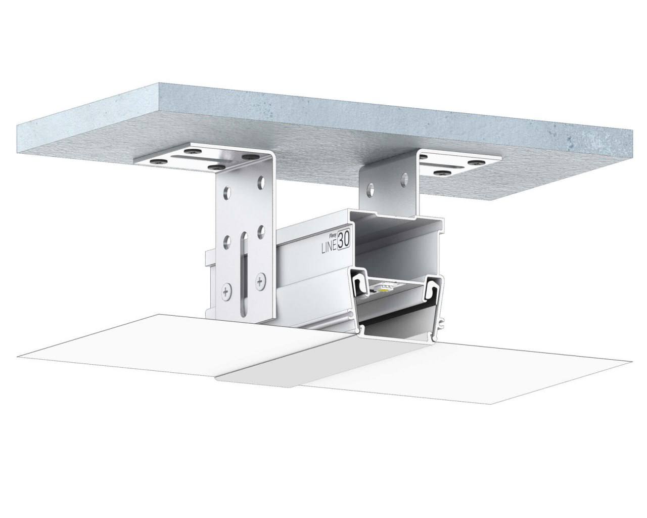 Разделительный профиль Flexy LINE 30 для натяжных потолков с гарпунной системой крепления полотна. Для изготовления световых линий. Для установки тканевого полотна нужен гарпун клинч.