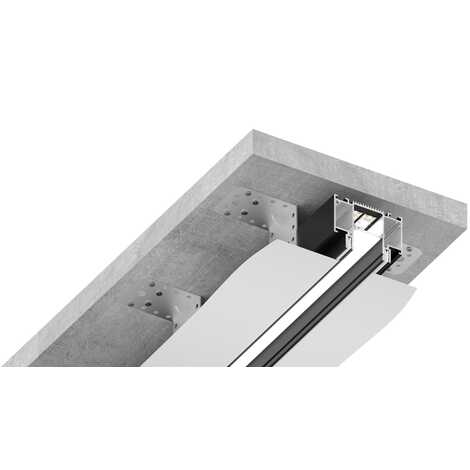Главная особенность данного решения — демпферная система крепления, которая обеспечивает бесщелевое примыкание, подходит для ПВХ и тканевых полотен. Профиль поставляется в комплекте с демпфером. Доступен в черном и белом цветах.
