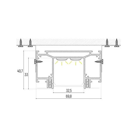Главная особенность данного решения — демпферная система крепления, которая обеспечивает бесщелевое примыкание, подходит как для ПВХ, так и для ткани. Дополнительными элементами решения являются торцевые заглушки и система стыковки в четырех точках (для углового и прямого соединения). Профиль поставляется в комплекте с демпфером.