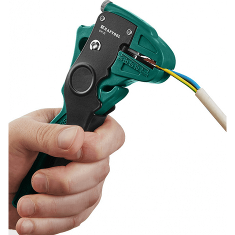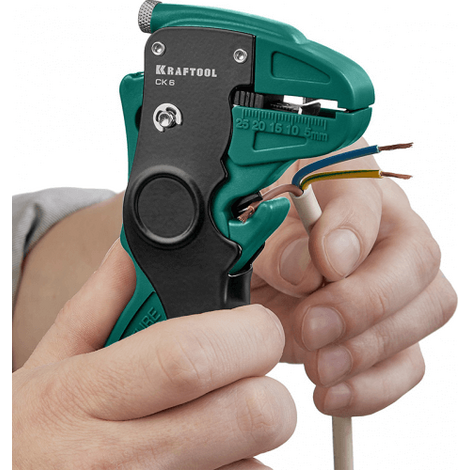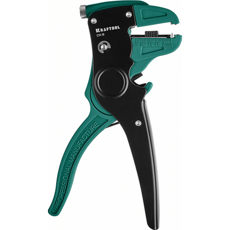 Автоматический стриппер Kraftool CK-6 предназначен для снятия изоляции с проводов диаметром от 0,2 до 6 мм². Он оснащён автоматической настройкой на размер изоляции и регулятором длины снятия изоляции. Также имеется возвратная пружина для увеличения скорости работы и регулятор усилия снятия изоляции.