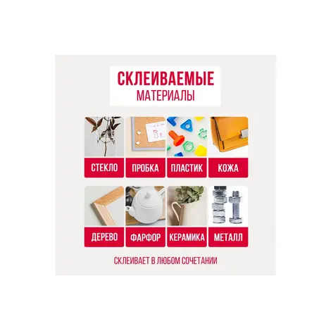 СКЛЕИВАЕТ В ЛЮБОМ СОЧЕТАНИИ • дерево • пробка • пластик • кожа • резина • фарфор • керамика • металл