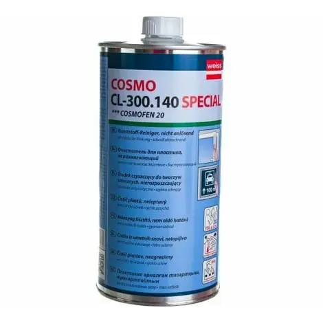 Очиститель ПВХ Космофен 20 (Cosmo CL-300.140) — это нерастворяющее чистящее средство с антистатиком для очистки профилей из жёсткого ПВХ, полиуретана и плит из жёсткого пенопласта (ПВХ). Он также подходит для очистки различных пластмасс, таких как ПВХ, ПММА, ПК, SAN.